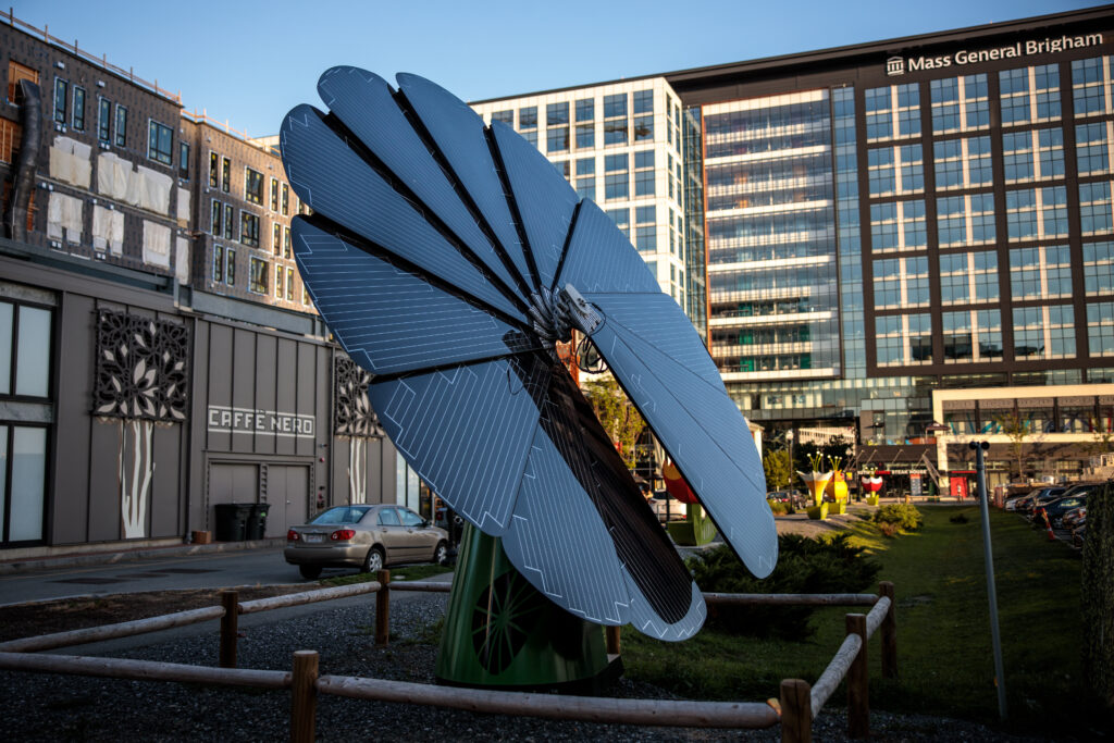 The property’s developer, Federal Realty Investment Trust, installed two SmartFlowers at Assembly Row along with other public art projects, such as “Bloom”, a series of interactive sculptures in partnership with Boston-based Artists For Humanity. This environmental statement not only produces clean energy, but also enhances the beauty of the existing art installations.